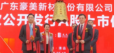 5月18日上午,豪美新材首次公開發(fā)行A股上市儀式在清遠(yuǎn)市國際會展中心舉行。伴隨著清脆的鐘聲,開市寶鐘敲響,豪美新材迎來登陸深交所的第一個(gè)交易日,成為在深交所上市的首家清遠(yuǎn)本土企業(yè)。